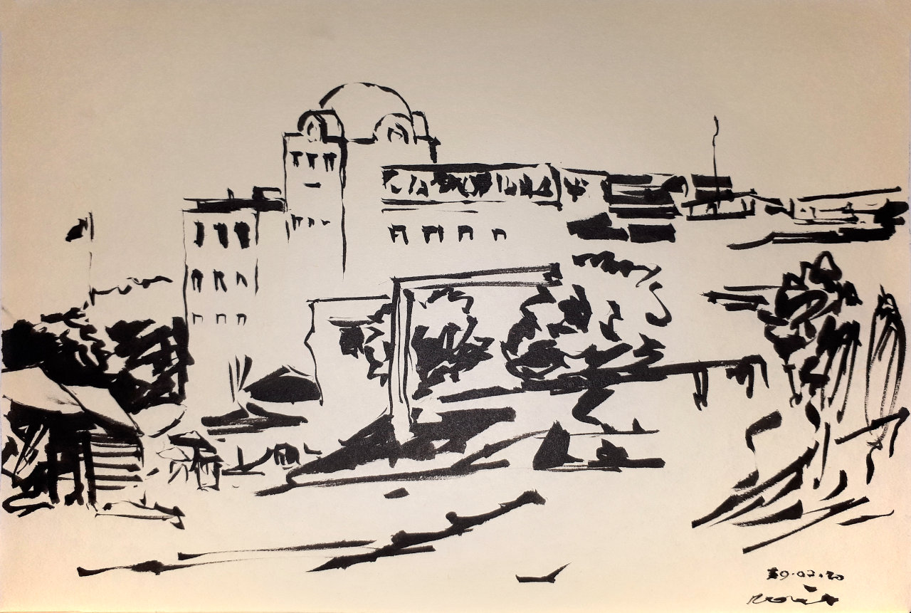 I finally went to the beach alone, which allowed me bring my painting stuff. I first did a sketch with my calligraphy pocket brush of the iconic casino building that I had been eyeing quite some time now. I was very satisfied; First of all I feel the likeness is there, and I like the noisy details on the ground level and particularly the umbrellas on the left side: some are white on dark, some dark on white! This light/shadow play is my favourite! After that, I did a quick watercolor sketch of three figures standing on a slope. I liked the process in this one, more than the result; I tried painting only the shadows of the figures. Finally I did a payne's gray watercolor painting (sketch, whatever) of the aquarium building. I like this one quite a lot; I think I've captured the likeness of the buildings and I like the contrast in the forground being more than the background's - another application of atmospheric perspective.